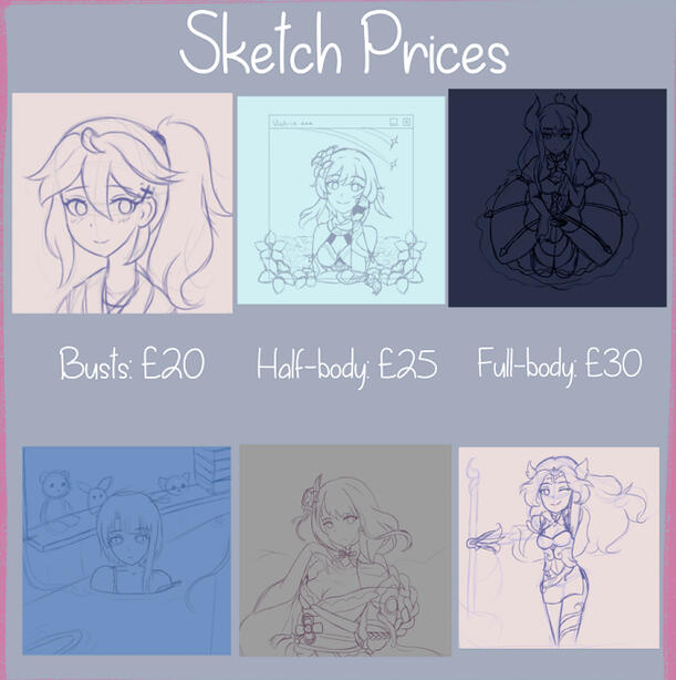 - You can request WIP sketches (for half-bodies and full-bodies) but you are only allowed 2 free revisions. Any additional revisions will incur a 5% fee.